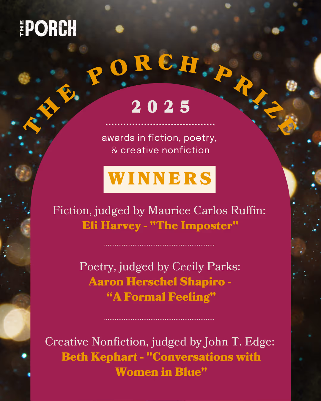 Workshops at the Porch are rigorous yet welcoming, encouraging creative expression while sharpening knowledge of craft. Led by experienced teachers, our classes allow participants to learn from one another in a supportive atmosphere.